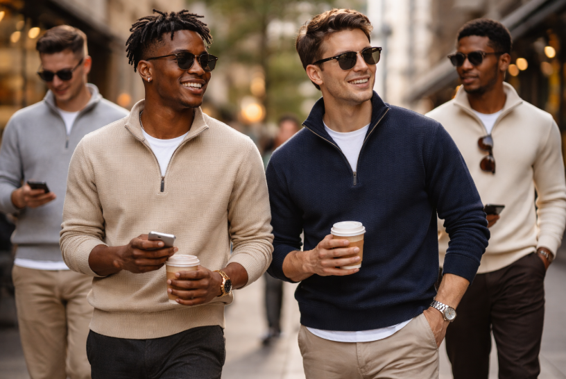 In late 2025, one of the most unexpected fashion movements didn’t come from the runways of Milan or the boardrooms of traditional menswear houses. Instead, it exploded on social media, led by everyday young creators redefining what it means to dress with intention. The subject? A humble garment that has existed for decades: the quarter-zip sweater. Suddenly, it’s everywhere, tucked into TikTok feeds, shared across Instagram Reels, and discussed in lifestyle circles as “not just a trend, but a movement.”